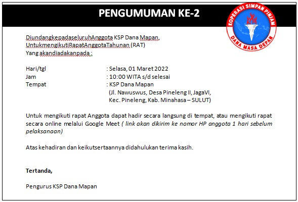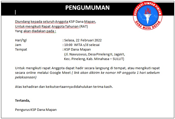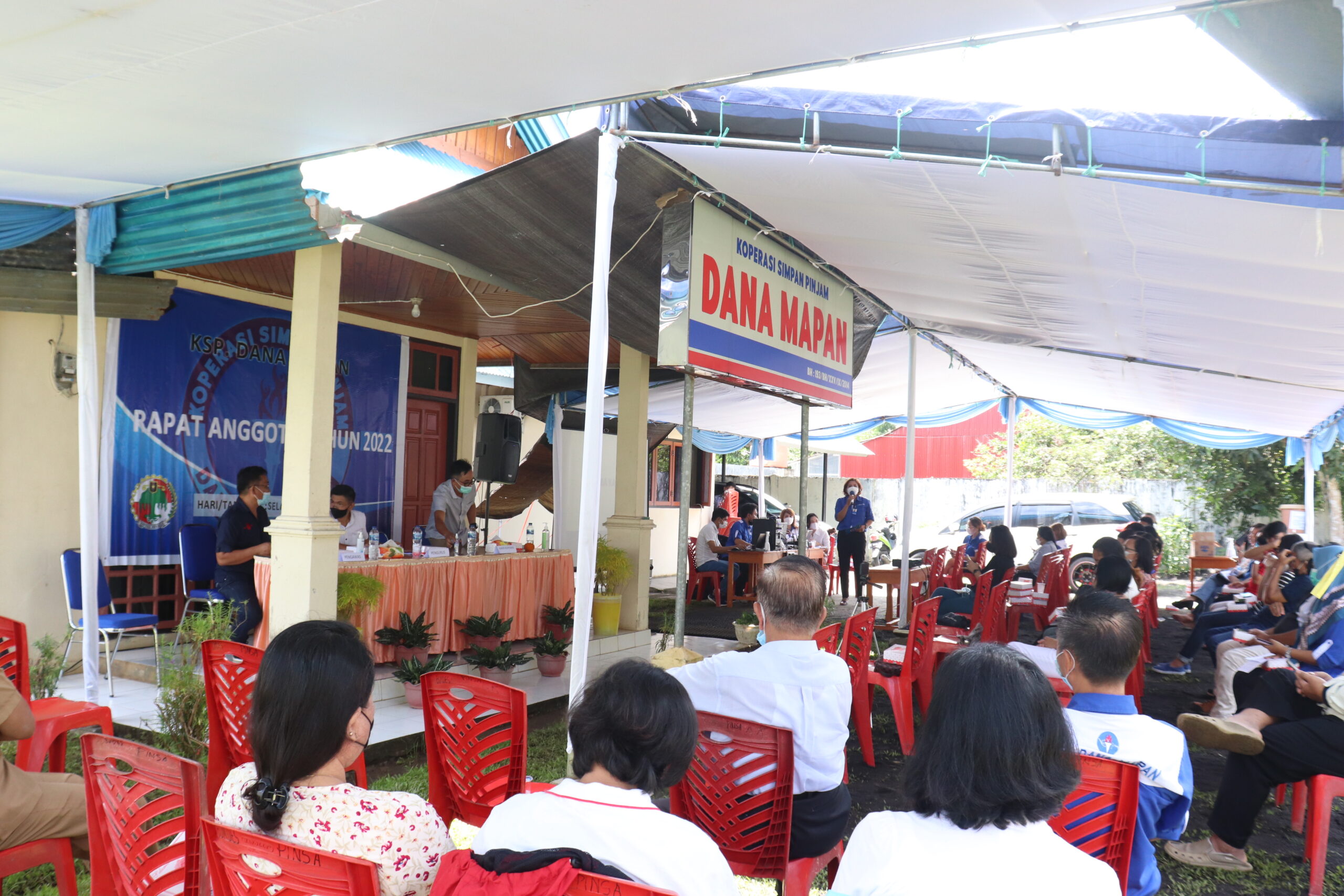 Kegiatan Rapat Anggota Tahun 2022 yang dipimpin langsung oleh Pimpinan KSP Dana Mapan ( Fransiskus Montolalu) Bersama seluruh Pengurus KSP Dan dihadiri oleh Dinas Koperasi dan UMKM Prov. SULUT yang diwakili Oleh Drs.Roike Frangki Kodoati selaku Sekertaris Dinas Koperasi dan UMKM Prov. SULUT, beserta Anggota KSP Dana Mapan
